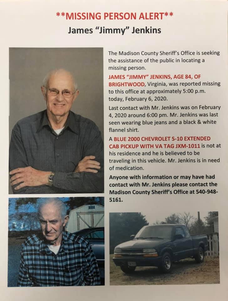 85-year-old James “Jimmy” Jenkins, of Brightwood, Virginia, was last seen on Tuesday around 6 p.m. He was reported missing around 5 p.m. Thursday.