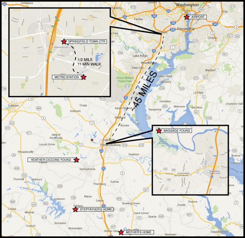 Across from Springfield Mall is (or was) a Hilton Hotel and behind that is the Beltway. To get to Regan National Airport from there, you would have to take the Metro (bus) to the Pentagon huge bus terminal and catch another to Regan. Would Katelin have known to do all of this? There is a lot of travel involved in public transportation to get to Regan from the mall area. Even the closest train would be in Alexandria. Springfield is approximately 9 miles from D.C..