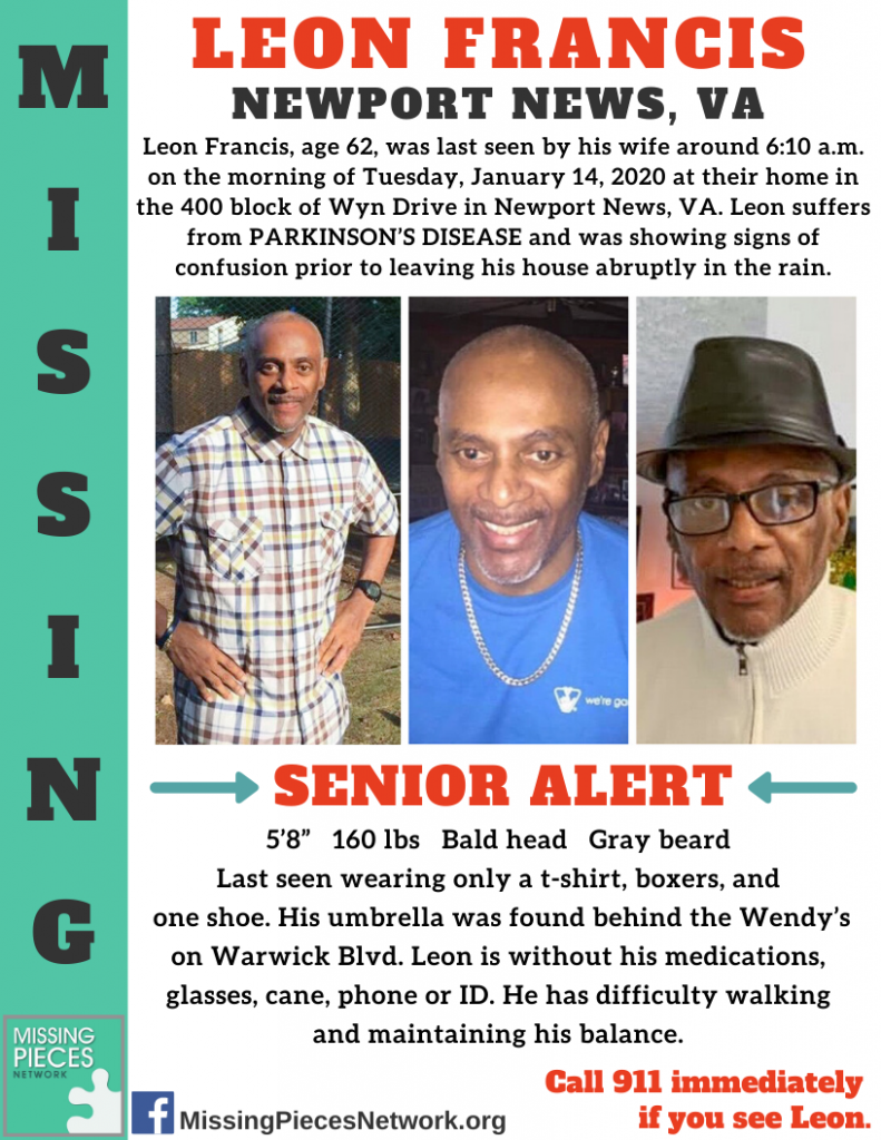 On January 14th, 2020 at 7:44 a.m., Newport News Police were dispatched to the 400 block of Wynn Drive in reference to a missing person. Upon arrival, officers made contact with the complainant who stated her husband was missing and was last seen at approximately 6:10 a.m. this morning. She identified her husband as 62-year-old Leon Francis.