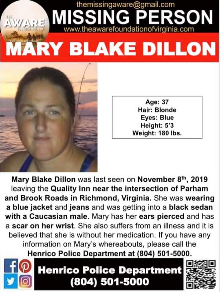Mary Dillon, 37, was last seen on Saturday, November 9, getting into a black vehicle.
