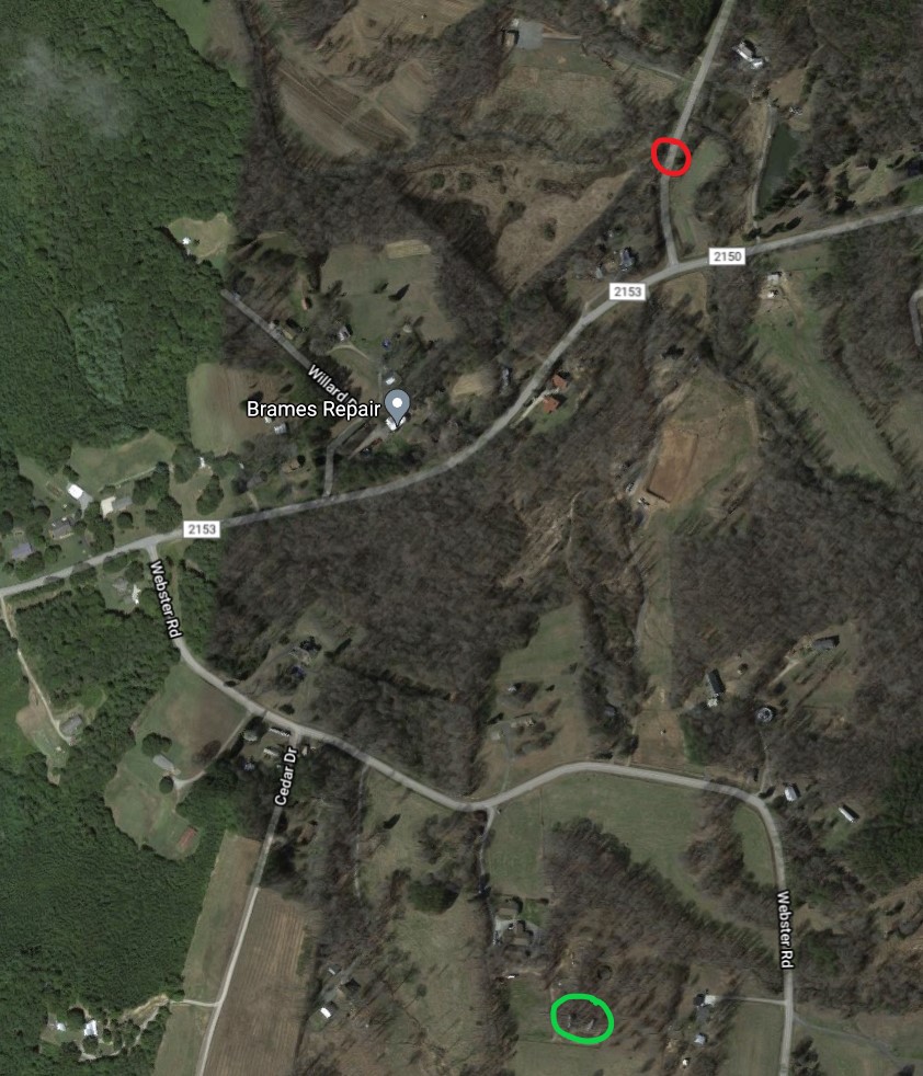Here's the body location circled in red and the location the suspect's trailer was moved to in green. The suspects van was moved to this property the day after the murders. I don't know what day the trailer was moved. Note the owner of this property defended the suspect and said he spent time with him on the day of the murders. He believes him to be totally innocent.