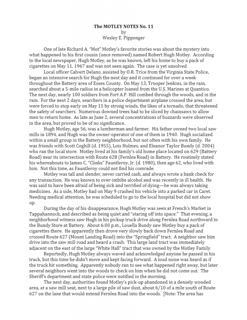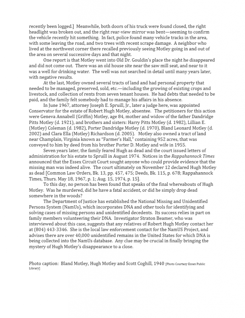 Circumstances: Last seen in Essex County VA. MP's vehicle was discovered near saw mill at state 627 and 628.