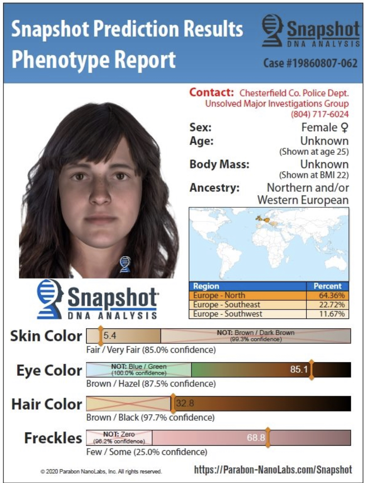 "Using DNA evidence from this investigation, Snapshot [a service of Parabon NanoLabs in Northern Virginia] produced trait predictions for the unknown woman," a Chesterfield Police spokesperson said. "Individual predictions were made for her ancestry, eye color, hair color, skin color, freckling, and face shape. By combining these attributes of appearance, a Snapshot composite was produced depicting what the unknown woman may have looked like at 25 years old and with an average body-mass index of 22."