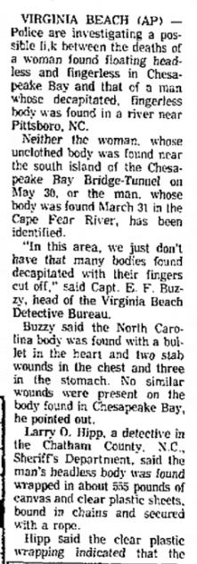 The victim was located in the Cape Fear River near the Carolina Power & Light plant intake valve. He was likely put in the water upstream in either Haw River or Deep River. His head and fingers had been removed. The lower part of his body was bound with 15 feet of chain.
