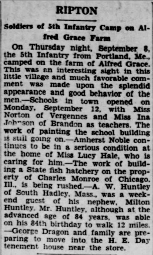 Burlington Free Press, September 15, 1927: "RIPTON: Soldiers of 5th Infantry Camp on Alfred Grace Farm."