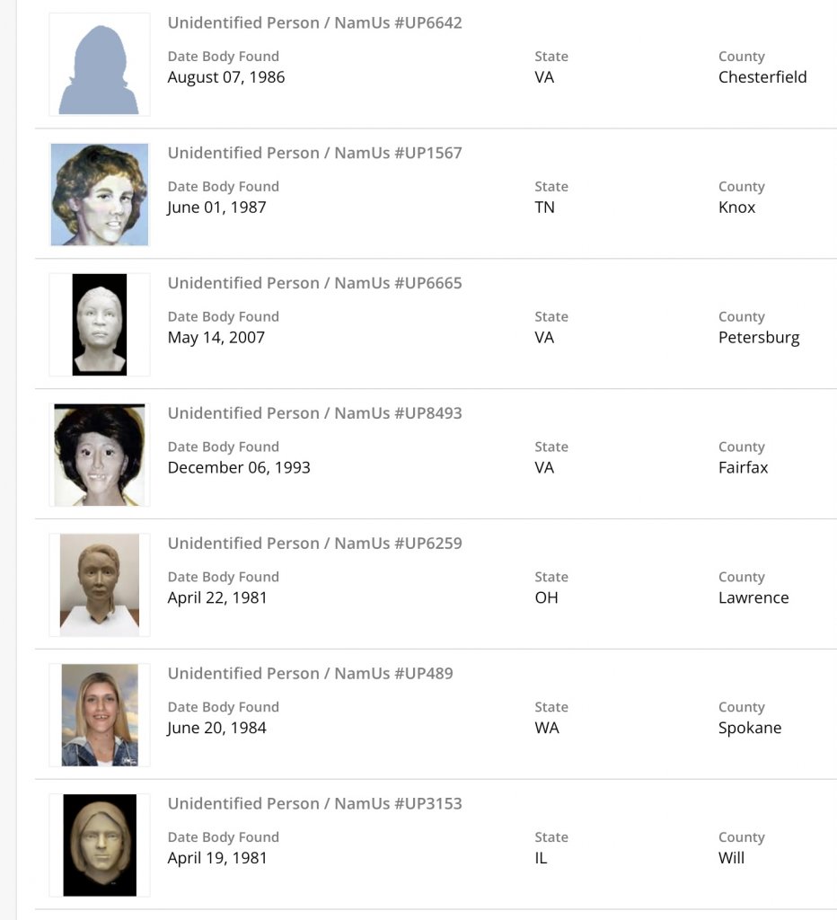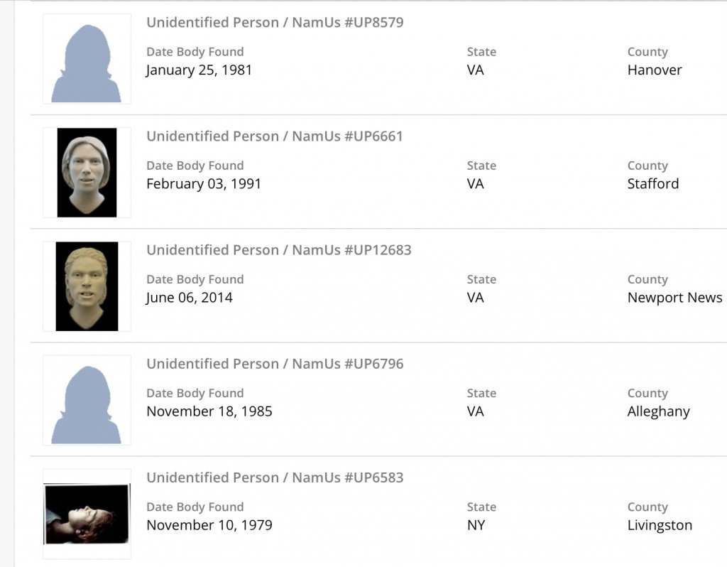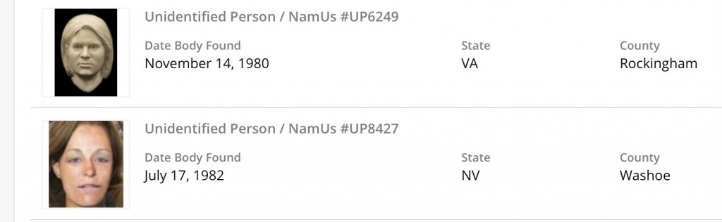 I hope that this is her as both cases are around 43 years old. All the base-line things match (height, weight). Let me know what you think about this potential match!