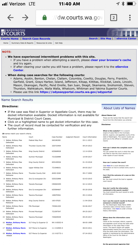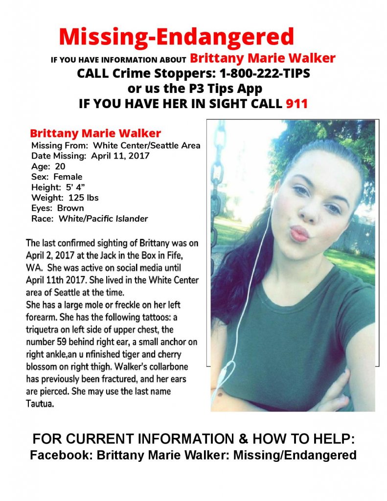 The last confirmed sighting of Brittany Walker was April 2, 2017 at the Jack in the Box in Fife, and her last post on social media was two days later. She was reported missing Sept. 20.