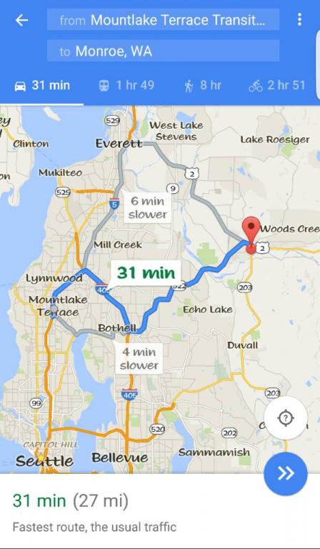 Here's a map from Monroe, WA to Mountlake Terrace. uploadfromtaptalk1455681472183.jpg