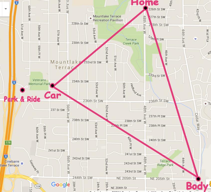 The more I consider it, I think this is especially true if the perp needed to get to work - much quicker to use his own car, then hit the road via 244th St, which leads right to I-5.
