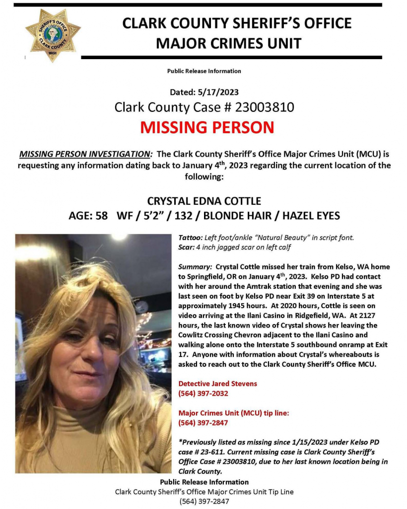 A bit more information: Her name was JoAnna Kyrstin May Speaks. She was a mother of three and battled addiction and she died as a result of blunt force injuries. She was killed somewhere else and her body moved to an abandoned property in Ridgefield. See this GoFundMe for more information: https://www.gofundme.com/f/joanna-k...P8lGMt4xYxhT2cdUpTOHM8uKklt0OEqThpvGC4LOlZ2B0The body found in Ridgefield has just been identified as 32-year-old Joanna Speaks, so the search for Crystal continues.