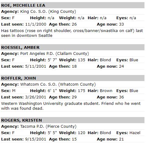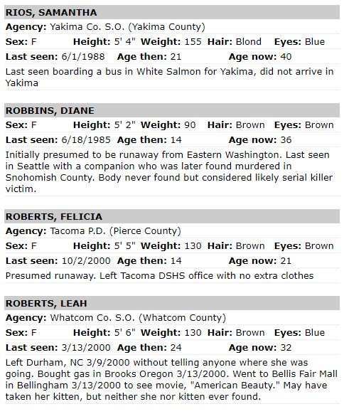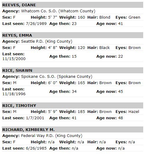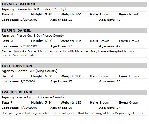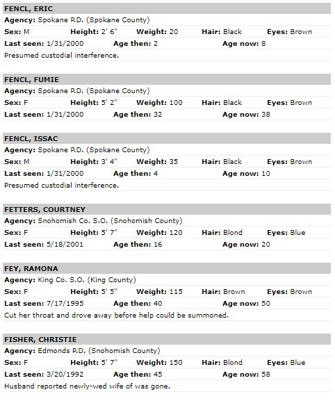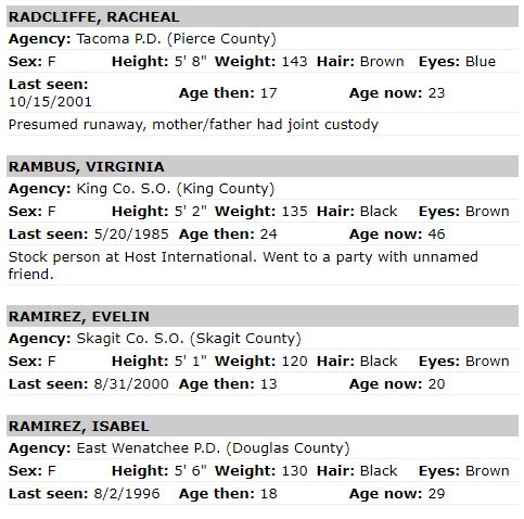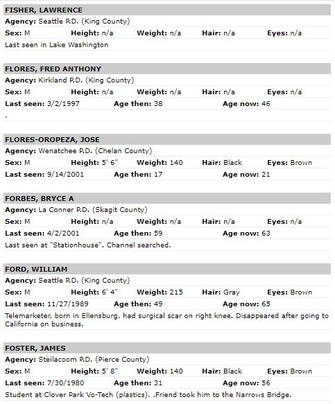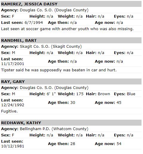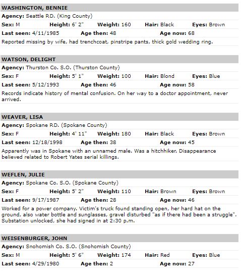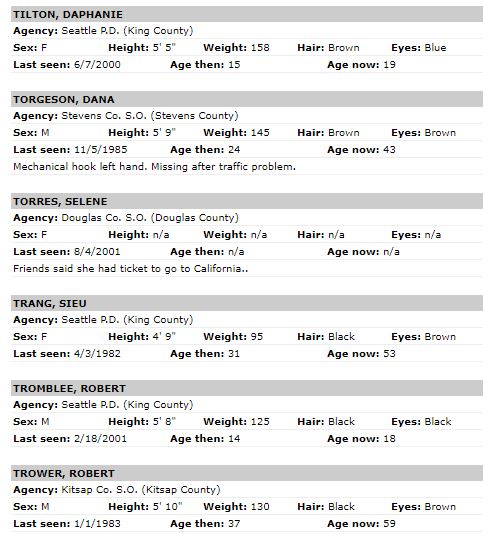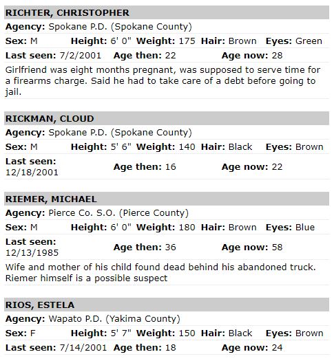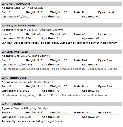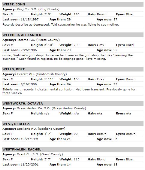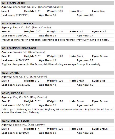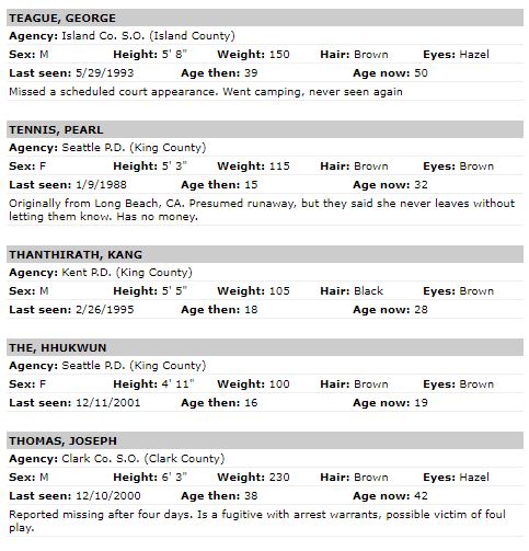 I can't think of anywhere else to post these, so here are all the missing persons records I could copy from the Seattle Post-Intelligencer regarding cases prior to 2002. I can't post a link here, because the site is defunct and I had to do some very complicated back-searching to get these.