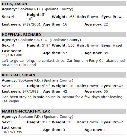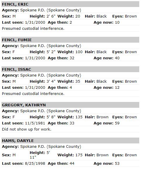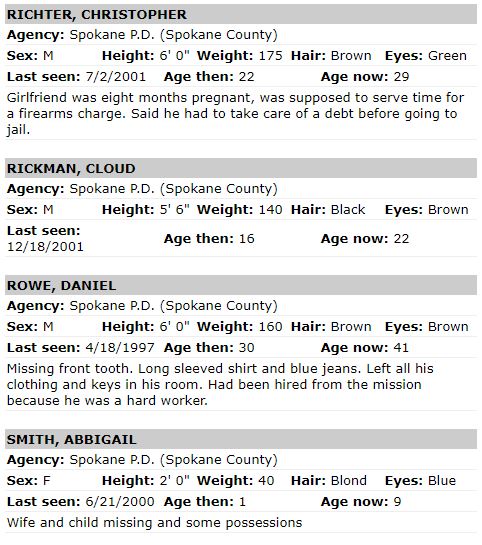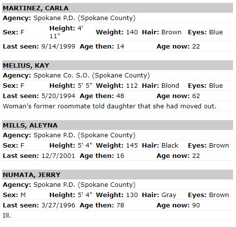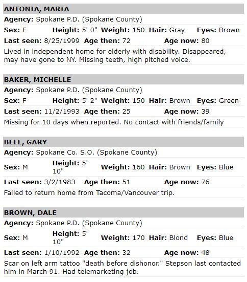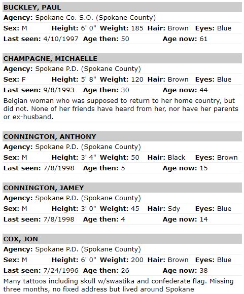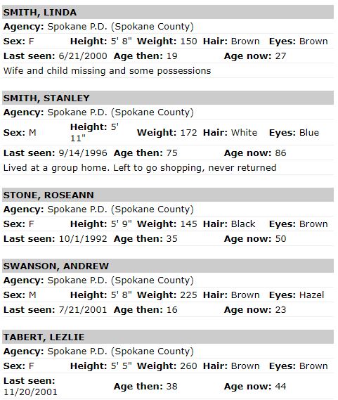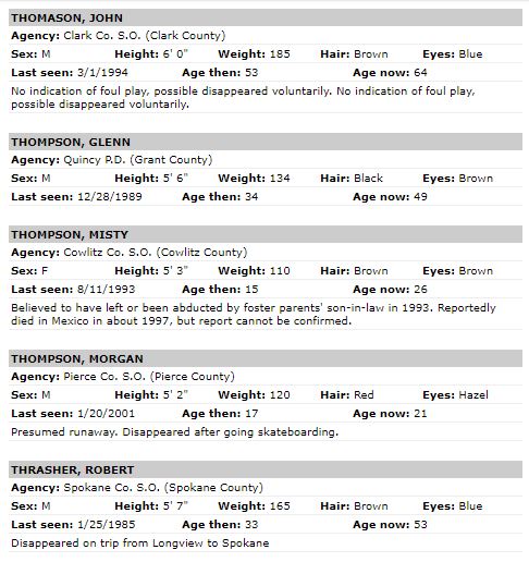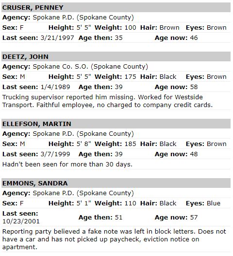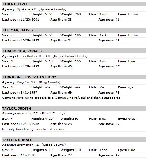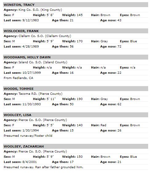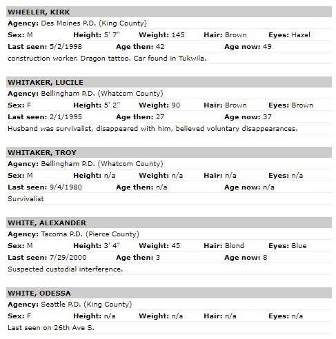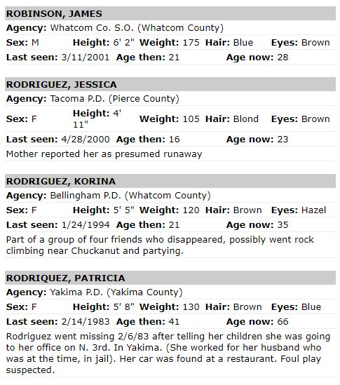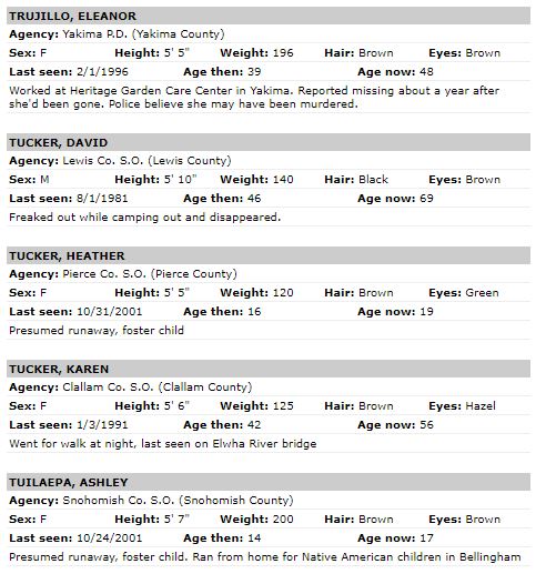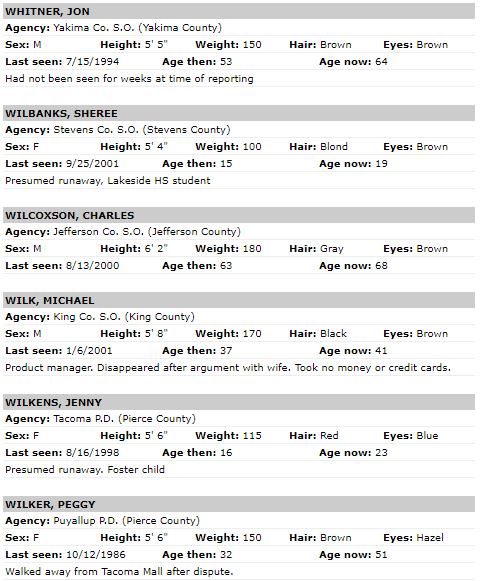 I can't think of anywhere else to post these, so here are all the missing persons records I could copy from the Seattle Post-Intelligencer regarding cases prior to 2002. I can't post a link here, because the site is defunct and I had to do some very complicated back-searching to get these.