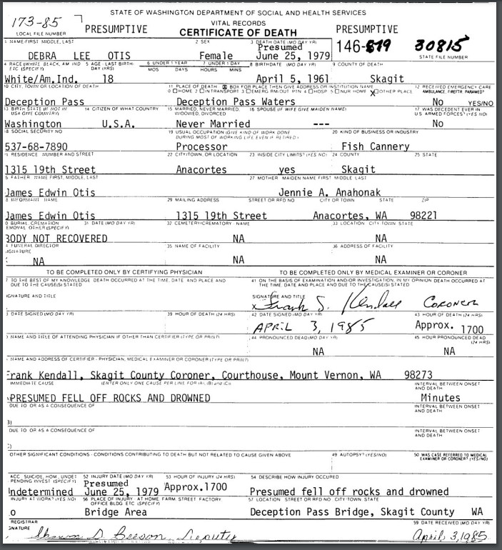 While with boyfriend, went missing on Pass Island at Deception Pass when in wooded and rocky area near water.