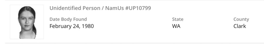 Diane is considered to be a victim of a potential serial killer, believed to have raped and killed 6 young Vancouver women, 8 total in Clark County between January 10, 1972 and October 1, 1974. He was tried for the death of one woman in 1978 and received life sentence. The bodies of five have been recovered in rural Clark County and deemed homicides. Diane is still missing, as is suspected victim Jamie Grissim.>>
