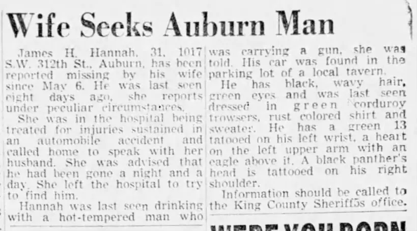 James Homer Hannah is a U.S. Army Veteran who was last seen in Auburn, Washington on May 6, 1962 drinking with what someone had described as a hot tempered man. This man whom he was drinking with was carrying a gun with him. James Hannahs car, a 1959 Chevrolet Biscayne Sedan, was found in the parking lot of a local tavern. James Homer Hannah is 31 years old as of the date he went missing in May, 1962. James Hannah is described as a white male standing 5 feet 10 inches to 5 feet 11 inches tall and weighing approximately 175 to 180 pounds. James Hannah has black wavy hair and green eyes. He was last seen wearing green corduroy trousers and a rust colored shirt and sweater. James Hannah has a two inch scar on chin, three inch scar on upper left arm, scar from left of hip to right side of groin (bayoneted while stationed in Korea), and a deep scar on right knee cap from broken knee received in auto accident. James Hannah has a green number 13 tattooed in his left wrist, a heart on the upper left upper arm with an eagle above it, and a black panthers head on his right shoulder. A DNA sample has been submitted to NAMUS. If you have any information about the whereabouts of James Homer Hannah, contact Detective Rob Jones of the Auburn Police Department at 253-931-3093 reference case #16-01888. (NamUs MP # 30450)