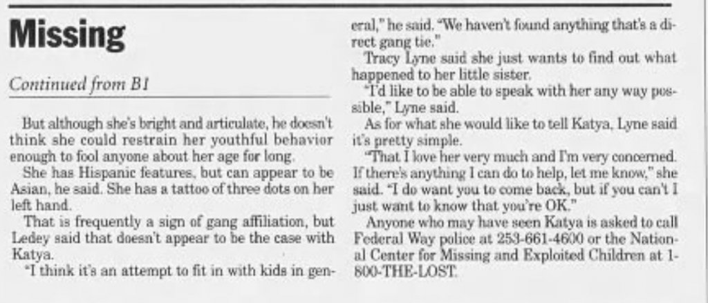 Katya has never been heard from again. She lived with her father at the time of her disappearance; her mother lived elsewhere in town. She and her father were apparently very close and there is no indication that she was abused by either of her parents. There is also no evidence that she was involved with gangs.