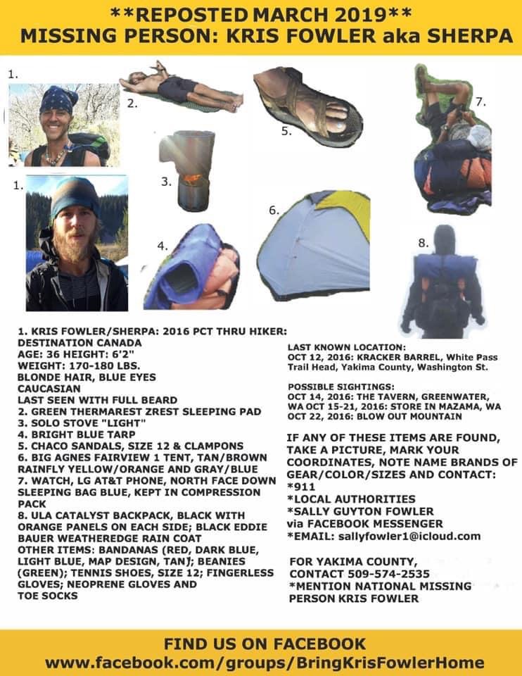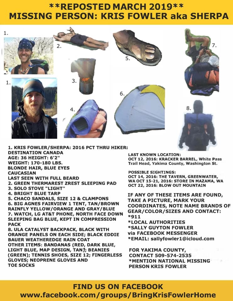 Sally Guyton Fowler still communicates every day from her home in Ohio with people who might be able to find her stepson, Kris Fowler. His trail nickname was “Sherpa.” The last confirmed sighting of the then 34-year-old came Oct. 12, 2016, near White Pass, where it’s believed he grabbed coffee before heading toward the Canadian border to complete the last 366 miles of his 2,600-mile journey.