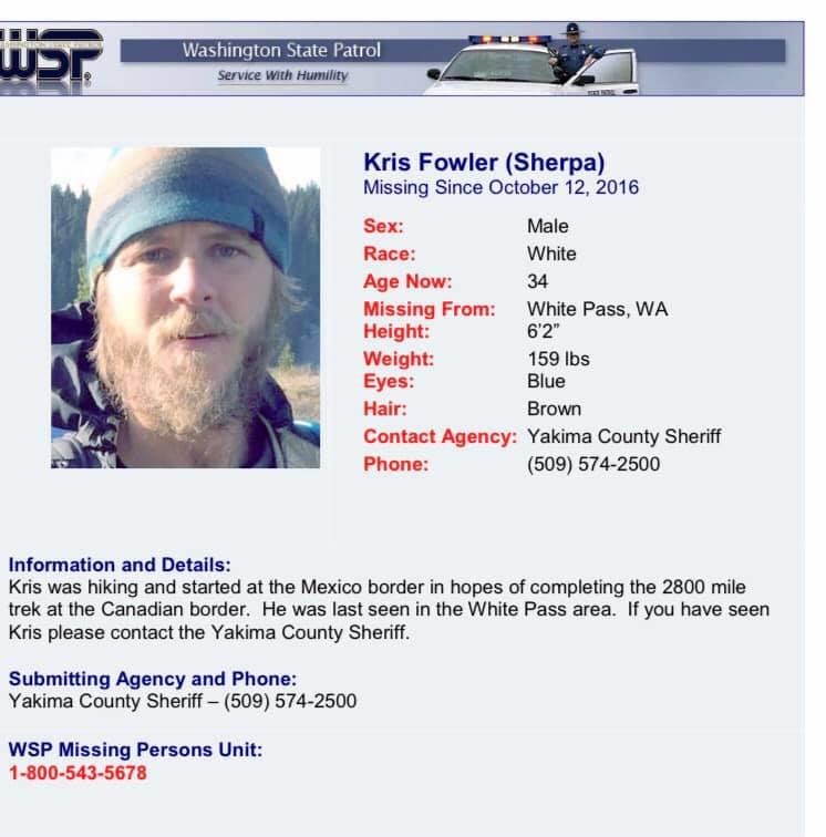 The search continues for missing Pacific Crest Trail hiker Kris Fowler, last spotted at White Pass in 2016