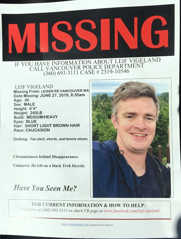 Vigeland’s bicycle was found Saturday at Wintler Park on the Columbia River in Vancouver. But Veigland, 36, has not been found, the agency reported.