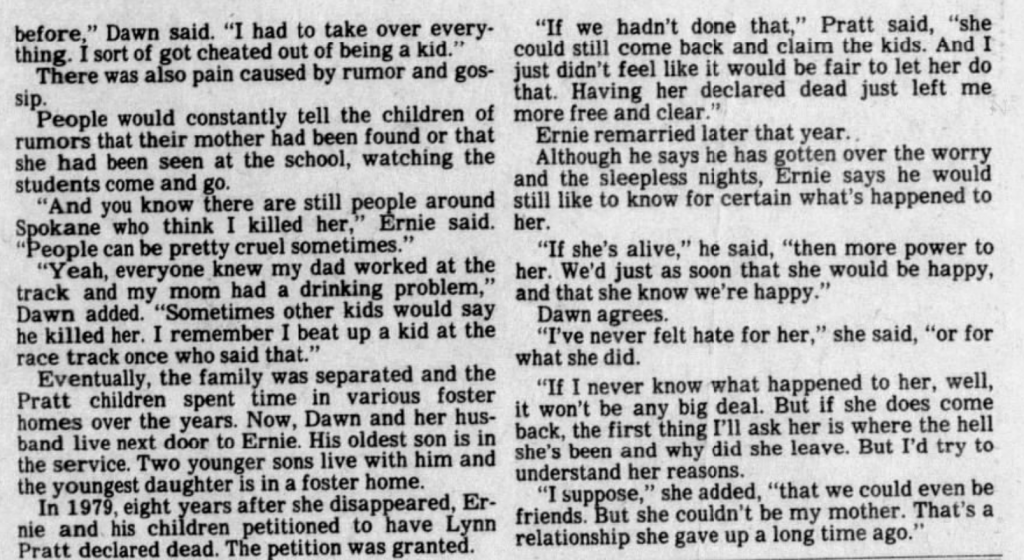 There was a huge article in The Spokesman-Review on May 10th, 1983. It raised the question of who the real Marilyn Pratt was. She is depicted as a borderline alcoholic in that article, someone that may have cheated on her spouse. The article left open the question of whether she was alive or dead.