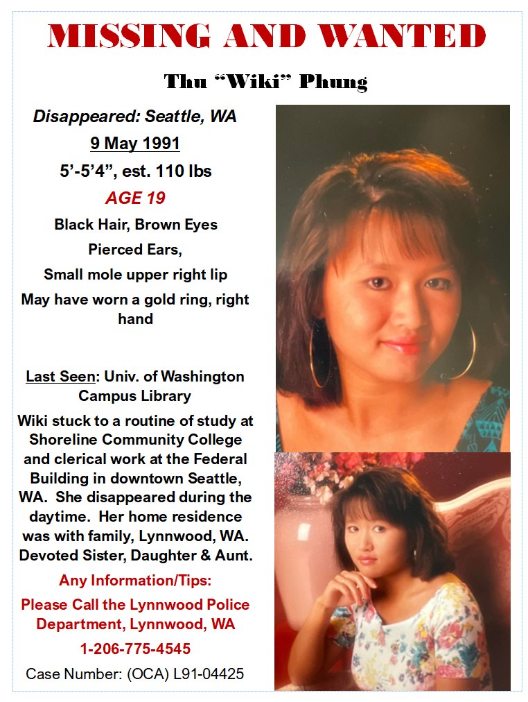 Wiki lived at home with her parents, who brought her and her other 5 siblings from Saigon, Vietnam to escape the historical Communist takeover; and she was thriving: a loving family, a high school diploma, good friends. Wiki was a Seattle college student with a clerical job at Seattle's downtown Federal Building. She disappeared without a trace while going to and from school, work and home. Due to the timing of her disappearance she was hurriedly grouped into a pool of the many unfortunate missing women who were considered to be victims of the Green River Killer (now known as Gary Ridgeway), or a copycat killer. She neither matched the Ridgeway's victim pool, their circumstances or his well-defined hunting grounds.