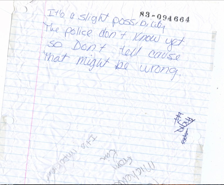 2. The class note evidence publicly released in 2008. Now considered irrelevant despite the writer's father being a cop in the same department at the time!