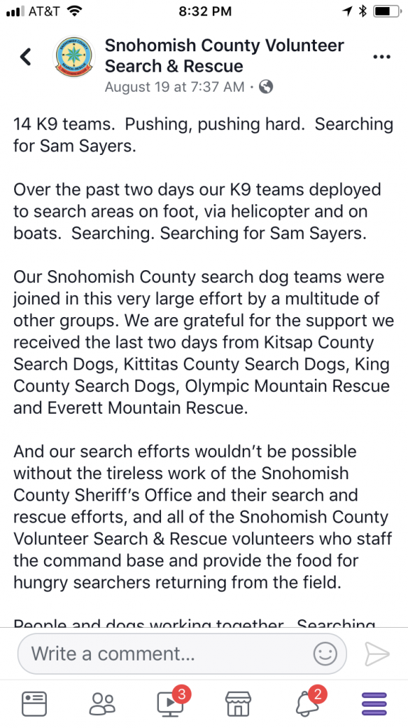 The dog was an air scent dog, which is a dog that is trained to pick up human scents. The mother mentioned that this means that they are not trained to find a particular scent, but rather ANY human scent. They sent technical climbers and helicopters in to look in that area, but nothing was found.