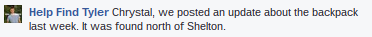 The May 8th post from the Help Find Tyler FB page states, "Tyler was dropped off on Viking Ave. between Poulsbo and Silverdale. The gentleman said that Tyler was asking for directions to Shelton."