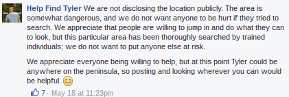 But all of that hinges on the idea that it was Vance Creek Bridge. The are other places that would be "dangerous" to ask untrained volunteers to search - woods, bodies of water, etc. Now that the search is past, I wish they would just say where it was. Maybe they have some other valid reason not to.