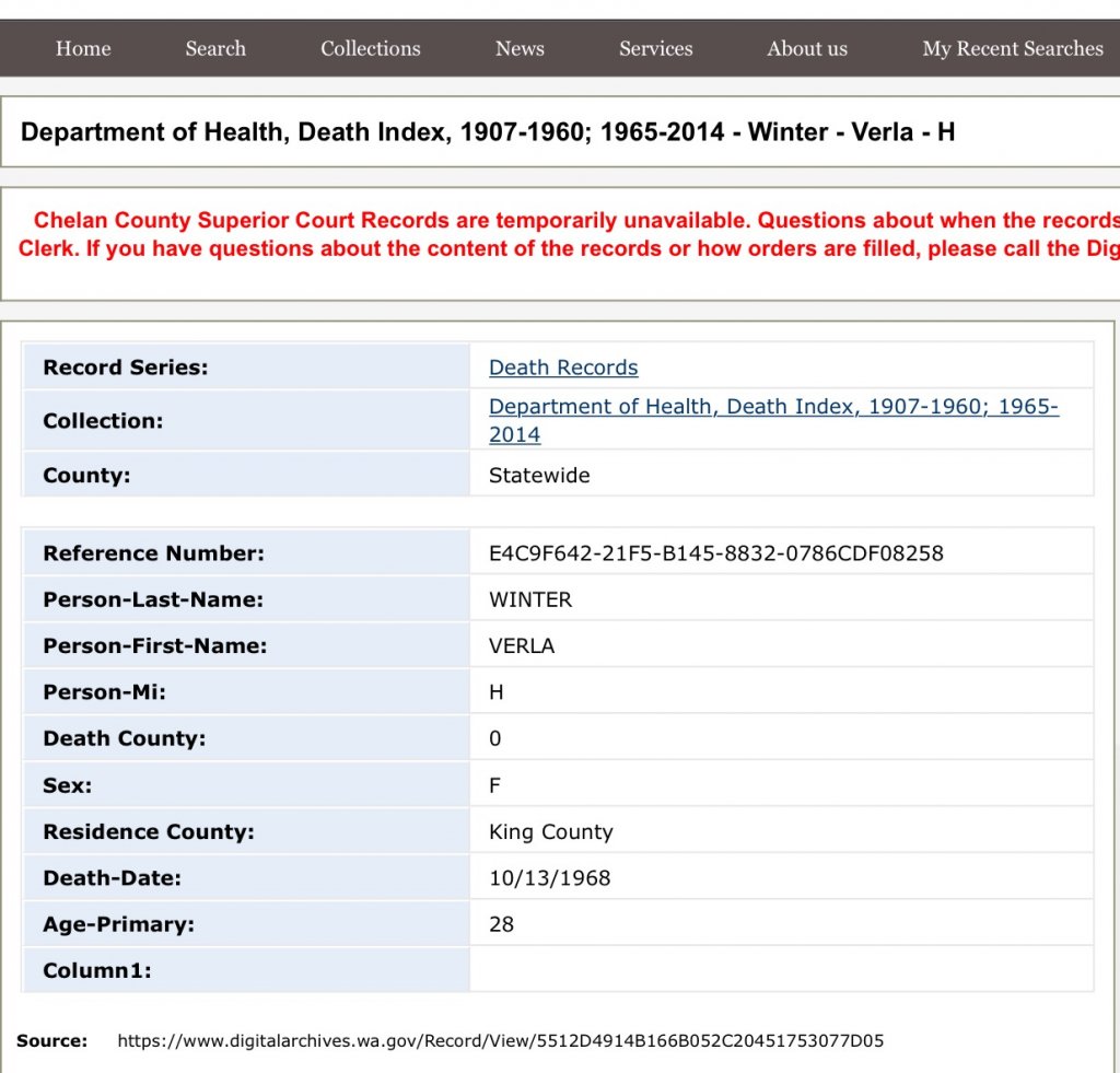[h=3]Details of Disappearance[/h] Winter was last seen at her home in Kent, Washington on October 13, 1968. Her husband said they had been separated and he returned to the family home the previous night. He and Winter argued because she didn't want him to stay. He went to bed, and when he woke up the next morning, Winter was gone, and so were her belongings and $400 in cash.