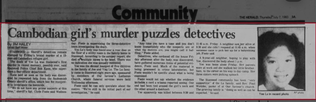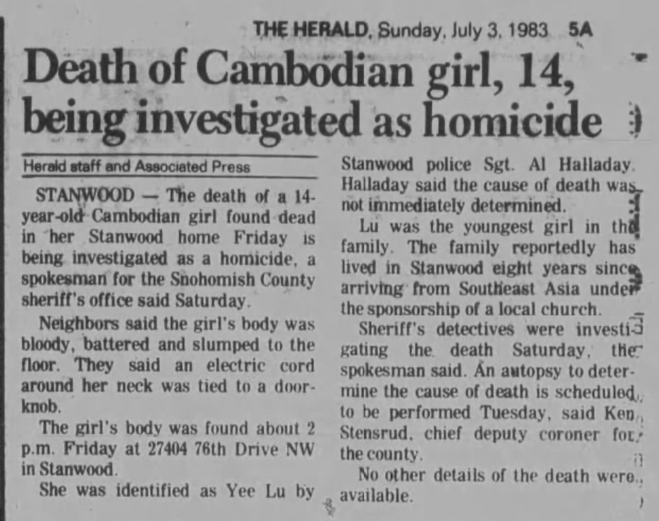 The death of Yee Lu was Stanwood's first murder in recent memory, possibly ever, said Starwood’s Police Chief Bob Kane, who supervises a four-officer department.