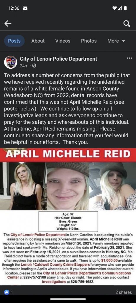 "To address a number of concerns from the public that we have received recently regarding the unidentified remains of a white female found in Anson County (Wadesboro NC) from 2022, dental records have confirmed that this was not April Michelle Reid (see poster below). We continue to follow up on all investigative leads and ask everyone to continue to pray for the safety and whereabouts of this individual. At this time, April Reid remains missing. Please continue to share any information that you feel would be helpful in our efforts. Thank you."