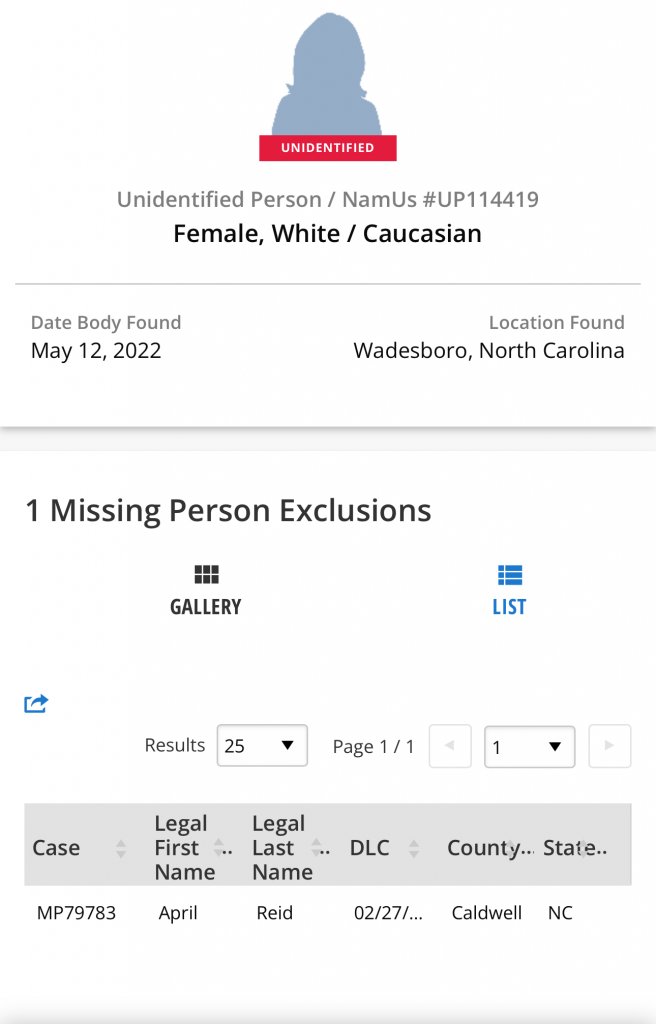 "To address a number of concerns from the public that we have received recently regarding the unidentified remains of a white female found in Anson County (Wadesboro NC) from 2022, dental records have confirmed that this was not April Michelle Reid (see poster below). We continue to follow up on all investigative leads and ask everyone to continue to pray for the safety and whereabouts of this individual. At this time, April Reid remains missing. Please continue to share any information that you feel would be helpful in our efforts. Thank you."