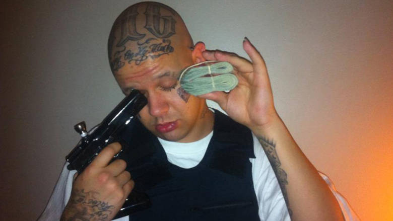 Gun in one hand, a wad of folded money (I think?) in the other, I wonder did this photo motivate and portray DMs actions?