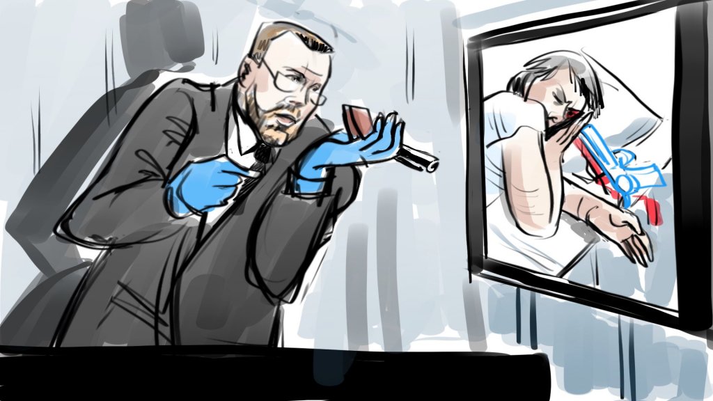 But more importantly, although he attempted to disprove a suicide took place, he left it at that. Unless I missed something, I thought he’d go on to create a possible scenario by duplicating the gun residue on the bed/pillows to prove a shooter was positioned beside the bed and dresser. But he didn’t do that. Was it because he was unable or wasn’t he asked to? We don’t know that either.