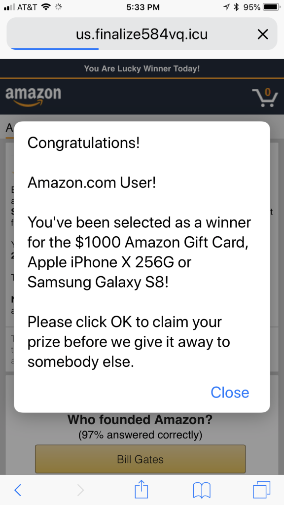 I was just reading the April Tinsley thread when I got three pop up notices that I won $. Here are the screenshots. Both times I was not scrolling or even touching my screen. It happened at 5:32 pm Pacific. I closed my browser, deleted history and had to log into Websleuths again.