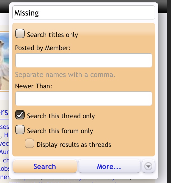 For instance, you remember somebody mentioning cupcakes in this thread a couple of days ago (note: this may or may not have actually happened). On the previous site, you could search just this thread for the word "cupcakes" and find all the posts containing that word. ETA: To clarify, I can find a way to search ALL threads, but not just one.Search a thread? What does that mean? Could you please give an example. Then when your question is answered hopefully I get it lol.