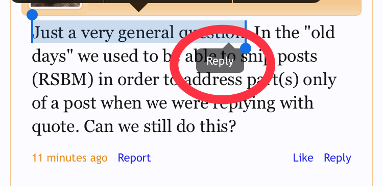 Just a very general question. In the "old days" we used to be able to snip posts (RSBM) in order to address part(s) only of a post when we were replying with quote. Can we still do this?