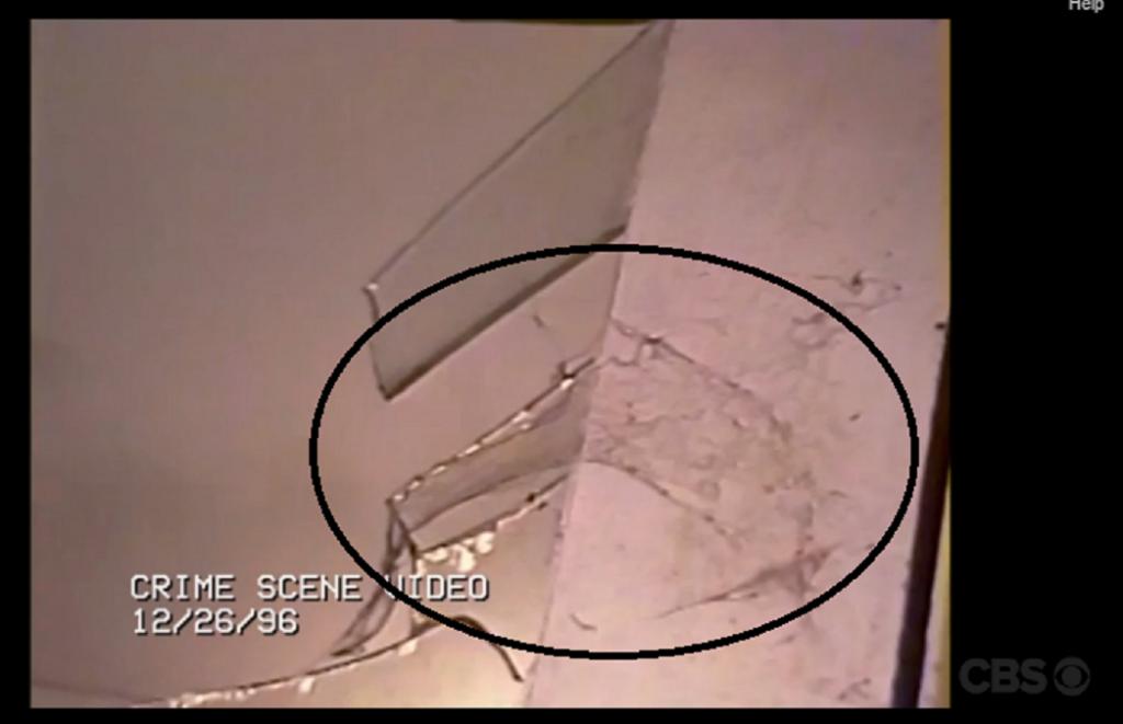 I've managed to get a screenshot of the broken glass in the basement window from the CBS program. Taken from the actual crime scene video, the cobweb was flickering in the movement of the air on the broken glass, which seems to be proof it wasn't broken that night.