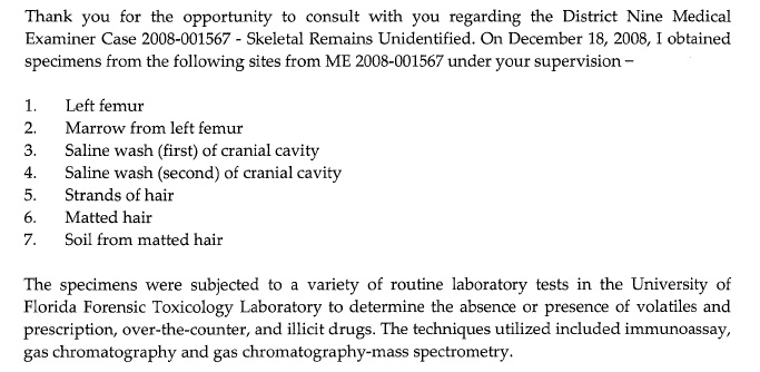 According to these results, she did not find anything other than dirt. In the first attachment you will note that two washes (items 3 and 4) were submitted for analysis to UF College of Medicine, Forensic Tox Lab. The results are listed in the second attachment. Found at this link (last two pages): http://www.wesh.com/download/2009/0619/19802034.pdf