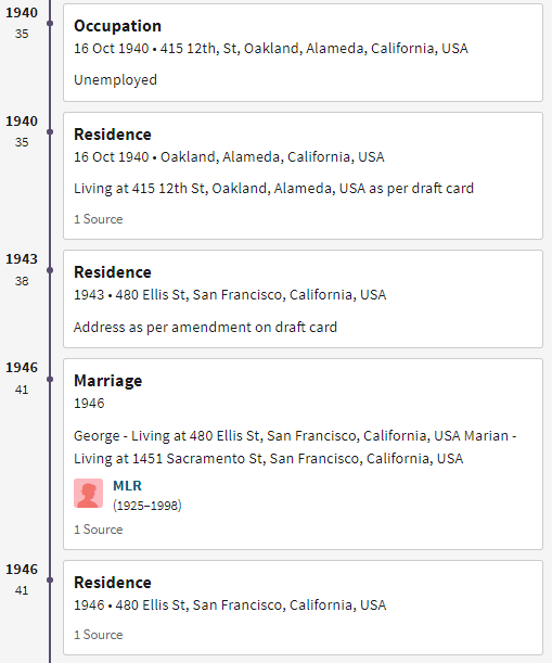 Both of these addresses appear to be Tenderloin area hotels. IIRC We had records of GB in Oakland through 1944 then he was unaccounted for until he appeared with MK in San Francisco (1950's?).