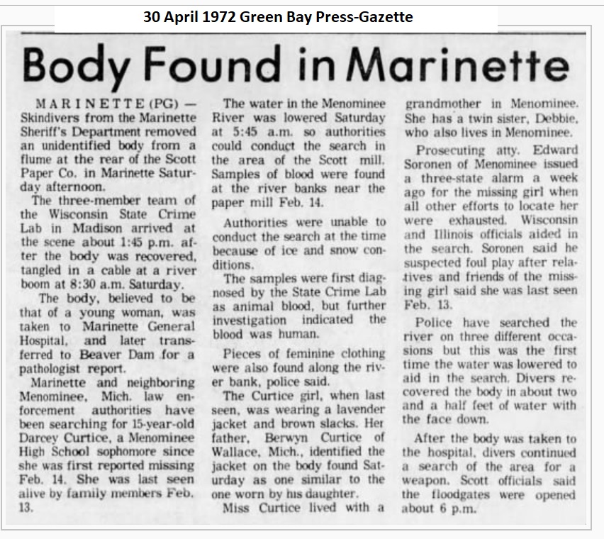 This and other unsolved murders in Marinette County are reported in this article from a Nov 7, 1977 Milwaukee Sentinel article: