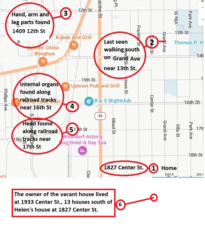 All locations are within 1.1 miles walking distance of 1825 Center St., where Helen Sebastian was last seen. Maybe the killer(s) didn't have a vehicle and carried the body parts to where they were found? It's even possible the murder also happened in this general area and the torso may still be buried nearby at the murder sight because it was too heavy to carry?