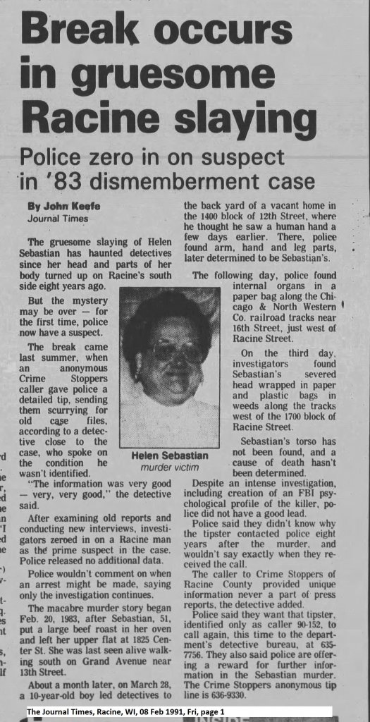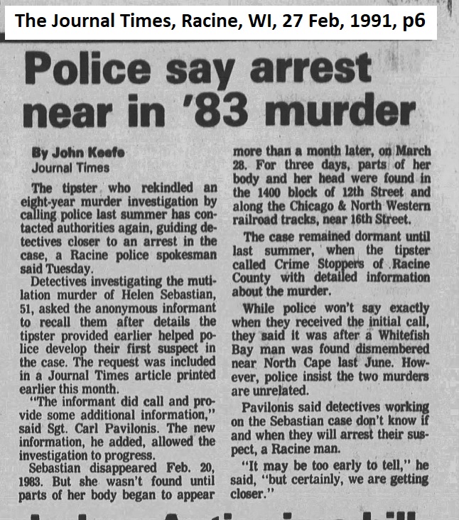 I'm curious to know if anyone has any information regarding the Helen Sebastian murder out of Racine, WI, 1983. I have been scouring the internet for over a week now, and have only found one YouTube video where it is briefly discussed, and two articles from the same publication (1991 and 2008). Here are the newsprint links: