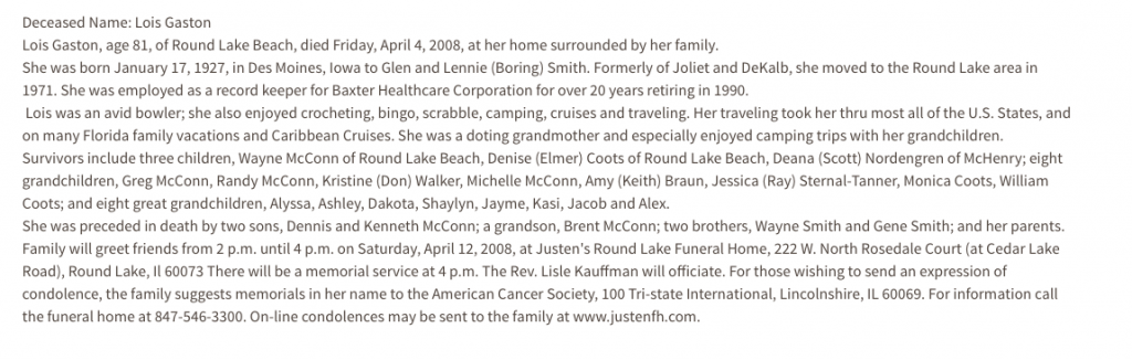 Born in 1947 in De Kalb, Illinois, Mr. McConn was last seen by his family leaving his home in Kenosha, Wisconsin in January 1977. On August 15, 1978 loggers found his remains in a remote wooded area in the Township of Knapp, Jackson County, Wisconsin more than 230 from Kenosha. His death is regarded as “presumed homicide”.