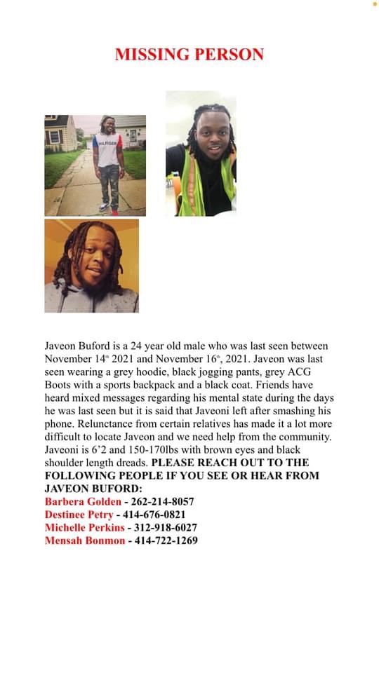 My name is Mensah Bonman. My son Javeoni Buford has been missing for over a year. I am in need of help from my community. My son Javeoni has been missing since November 16th 2021. I have done everything a Father is suppose to do looking for my son. I filed a missing persons report at the 5th district Milwaukee Police Department, I asked them to do welfare checks, and I got nowhere with that.
