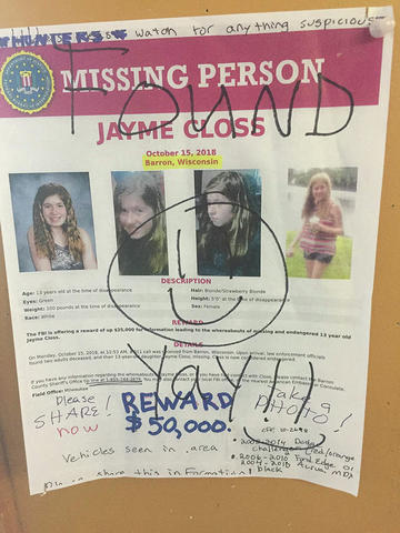 The 13-year-old Wisconsin girl from Barron had been missing since Oct. 15.