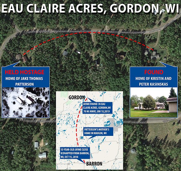 DailyMail.com can also reveal that on the day Jayme Closs escaped, Patterson had made the 56-mile trip from the cabin in which he was holding the 13-year-old to his mother's home in Haugen, Wisconsin.