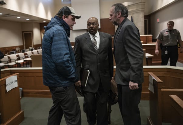Patterson's brother Erik wore a blue and black hooded jacket and sat hunched forward. His father, seated next to him, was dressed in a grey pin stripe suit. He took his glasses from his nose as he sat down and held them in his hands. He fretted with them briefly