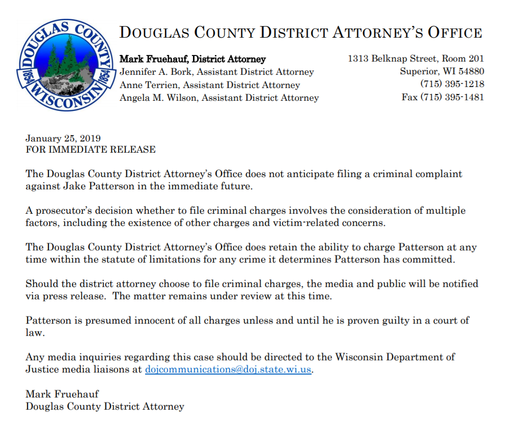 Douglas County, Wis. prosecutors won't file charges any time soon against Jake T. Patterson